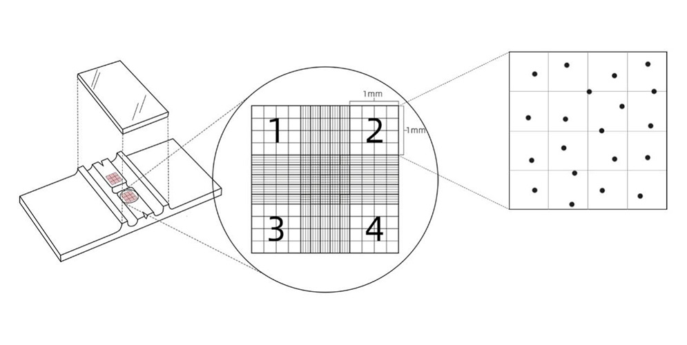 3) 分別計(jì)數(shù)大方格1-2-3-4中的細(xì)胞總數(shù)。
